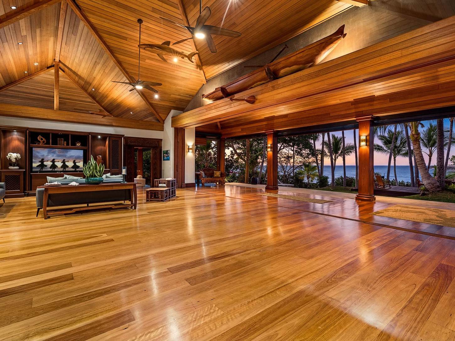 The main living pavilion is defined by soaring vaulted ceilings and exquisite wood craftsmanship that immediately grounds the home in its Hawaiian setting. Retractable screens and louvered doors dissolve the boundary between inside and out, inviting ocean breezes, birdsong, and the gentle sound of waves. Multiple seating areas make it easy for large groups to gather, relax, or spread out, while the open flow keeps everyone connected. The dining area is positioned to take full advantage of the ocean backdrop, creating a memorable setting for shared meals, celebrations, and long conversations that stretch into the evening.