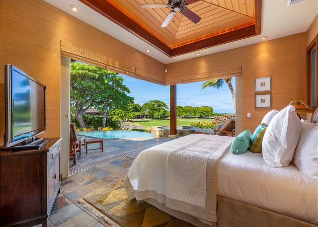 Located right on the 9th hole of Hualalai's Jack Nicklaus golf course with views of the Pacific Ocean, this beautiful and meticulously maintained home has been recently made available for private rentals. It's a short walk or golf ride (two golf carts are provided) to the Four Seasons Hualalai Resort amenities and facilities. The home is filled with light and has an open and spacious feel. The new Koa entertainment center is a highlight of the great room as it the newly enhanced landscaping which adds to the property ambiance. The dreamy chef's kitchen is equipped with a professional 6-burner gas range, wine cooler, Nespresso machine, two dishwashers, a warmer drawer, and bar refrigerator. Guest rooms include two master suites with king beds and private outdoor garden showers and a third bedroom with a queen bed and separate private courtyard. All bedrooms include luxurious Four Seasons linens. The location is quiet and the landscaping adds to the privacy, no car or foot traffic will spoil your stay. And the heated, infinity edge pool and adjacent hot tub completes this beautiful home. Come to the islands and enjoy the best of your home and Four Seasons resort amenities. Guests at this villa will have access to the Four Seasons Hualalai Resort. A mandatory daily resort guest fee per person, per day, will be payable directly to the resort. This daily fee includes access to the sports club, spa, golf course, beach and pool services, all resort restaurants (with the exception of members-only restaurant), ocean activity center, tennis club, kids club, and a resort-wide charge card and account. Note, this fee is subject to change without notice and some restrictions may apply.