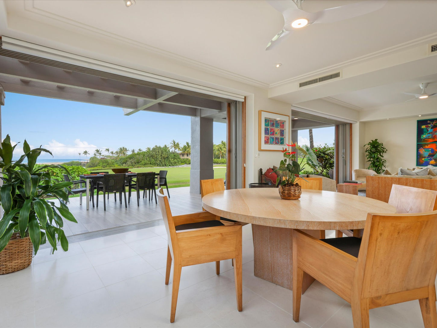 The well appointed kitchen has a center island, wine cooler, beverage cooler and wall ovens and adjoins the expansive great room with plush seating, a large flat-screen television, and a dining space for five. Floor-to-ceiling pocket doors optimize the views of the ocean, ancient fish ponds, and the 18th fairway and green of the Hualālai Golf Course.