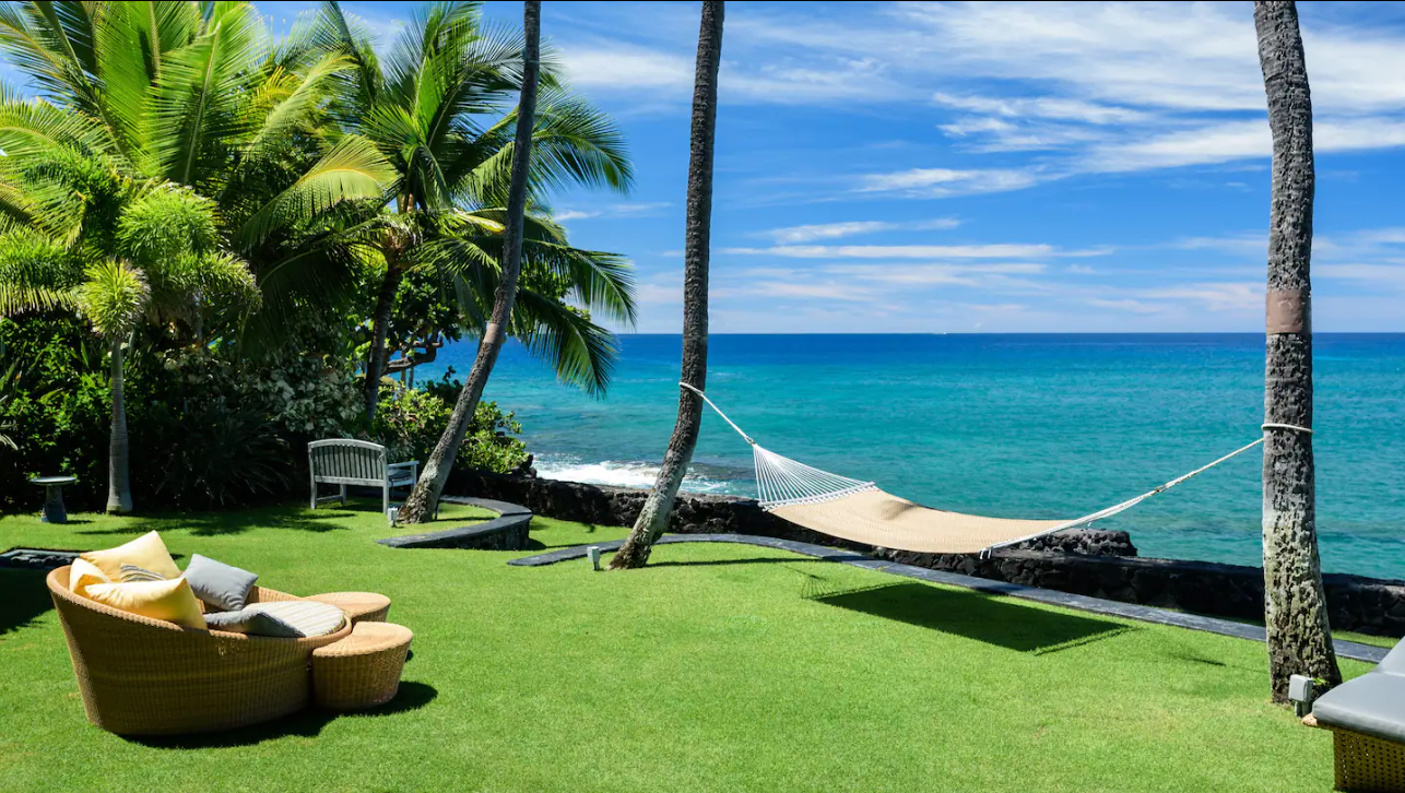 This luxurious gated oceanfront home located in one of Kona's most exclusive neighborhoods off of Kailua-Kona’s scenic Ali’i Drive boasts spectacular views of the ocean, large, comfortable living spaces, and every top-of-the-line upgrade imaginable. The house has 4 bedrooms with air conditioning, the remainder of the home is not air conditioned; each has a full ensuite bathroom. The great room is big enough for the entire family to gather and play, sit to chat and take in the view, eat at the large dining table, or just hang out. The kitchen is beautiful and has every imaginable appliance and convenience for the professional chef.