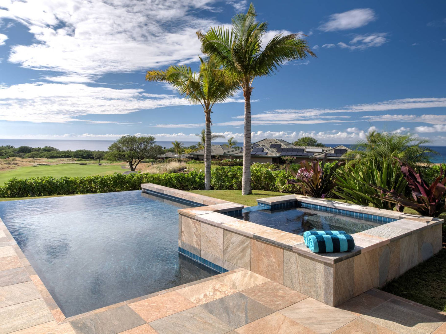 This lovely 4-bedroom, 4.5-bathroom private home offers sweeping ocean views and a separate cottage. This single level home enjoys a private swimming pool and spa with views from the Kohala Mountain range, Kawaihae, and the Pacific Ocean. A perfect view of the 14th hole will delight golfers. Eight guests are comfortable in the home with the main home featuring 3 bedrooms and 3.5 bathrooms, the separate guest cottage has a private entrance, additional bedroom, and bathroom.