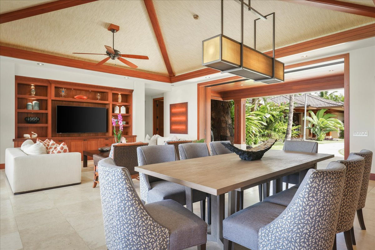 From Hawaii 4032, a 4 bedroom, 4.5 bathroom home, you’ll enjoy stunning views, gorgeous interiors, and unparalleled outdoor living. This secluded and tranquil retreat in the Pu‘ukole neighborhood is situated on the 13th hole of the Ke‘olu golf course and features captivating and expansive ocean views. Sunsets take center stage and are complimented by Maui and Kohala to the north. A large and gracious courtyard featuring a pond and bridge welcome you to the main home featuring a large living area, kitchen, primary suite, guestroom suite, and powder room. The main house kitchen features professional chef appliances, including 6-burner Wolf range, a Wolf wall oven, two dishwashers, and a side-by-side refrigerator and freezer. The large primary bedroom has a king bed and features a stone carved soaking tub and outdoor shower in the bathroom. The guest suite in the main house also has a king bed. All guest bathrooms feature outdoor showers. The two-bedroom ohana (family) guesthouse lies to the north and features its own living room with wet bar. Both bedrooms have queen beds.
