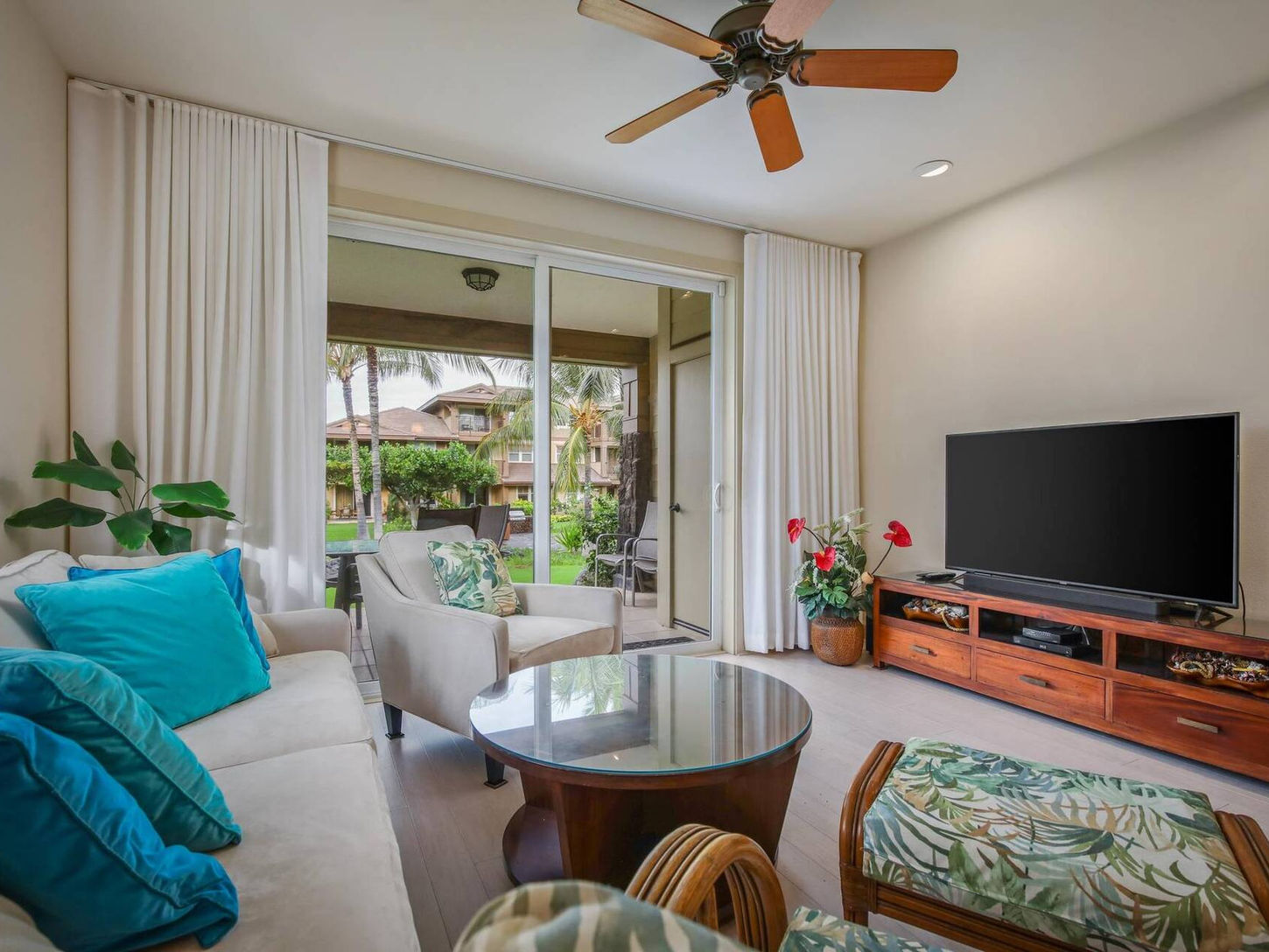 Hawaii 4091 is a beautifully appointed three-bedroom, two-bathroom luxury condominium that blends modern comfort with tropical tranquility. Situated in a coveted corner location, the home opens directly to the serene Coconut Grove—a peaceful garden dotted with hammocks and barbecue grills, ideal for barefoot afternoons and long, golden evenings beneath the palms.
