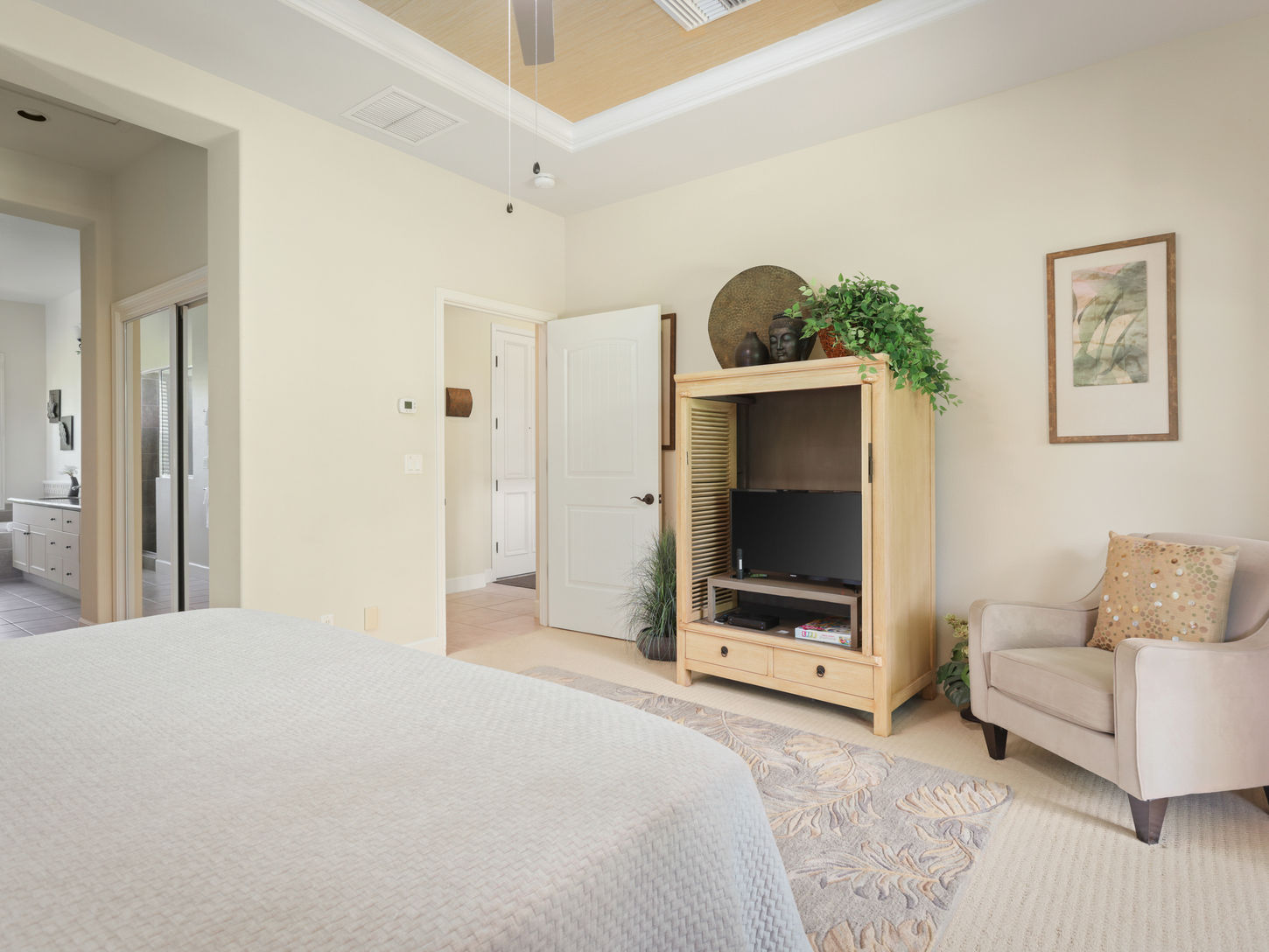 Primary Suite (2nd floor): King bed, en suite with double sinks, soaking tub, tiled shower, walk-in closet, TV, private lanai