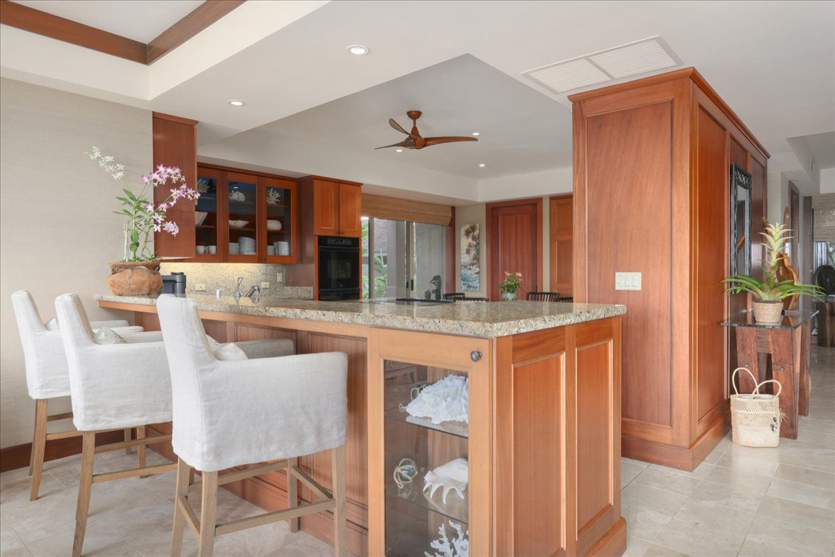 Set on the lower corner of the building’s single level, the residence opens effortlessly to a generous 569-square-foot lanai. Here, sweeping views of Hualālai Mountain and the rolling 5th and 6th fairways of the Ke‘olu Golf Course provide the perfect backdrop for sunset barbecues or slow mornings with Kona coffee. A built-in grill and covered outdoor seating area encourage al fresco moments from sunrise to starlight.
