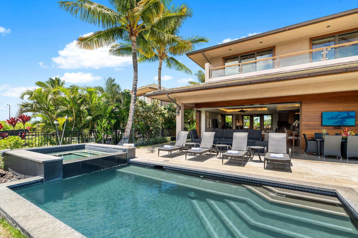 Welcome to Hawaii 4114, two side-by-side luxury villas on Hawaii’s Kohala Coast that together create the ultimate gathering place. With 8 bedrooms, 8 full baths, and 2 half baths across nearly 6,000 square feet, these residences are ideal for multi-family vacations, wedding parties, corporate retreats, or friends traveling together who want both privacy and shared experiences. Each villa offers golf course frontage, panoramic Mauna Kea mountain views, and a private pool and spa framed by lush tropical landscaping. Designed in harmony, both homes feature vaulted ceilings, open-concept layouts, and seamless indoor–outdoor living with expansive lanais and built-in BBQ grills.