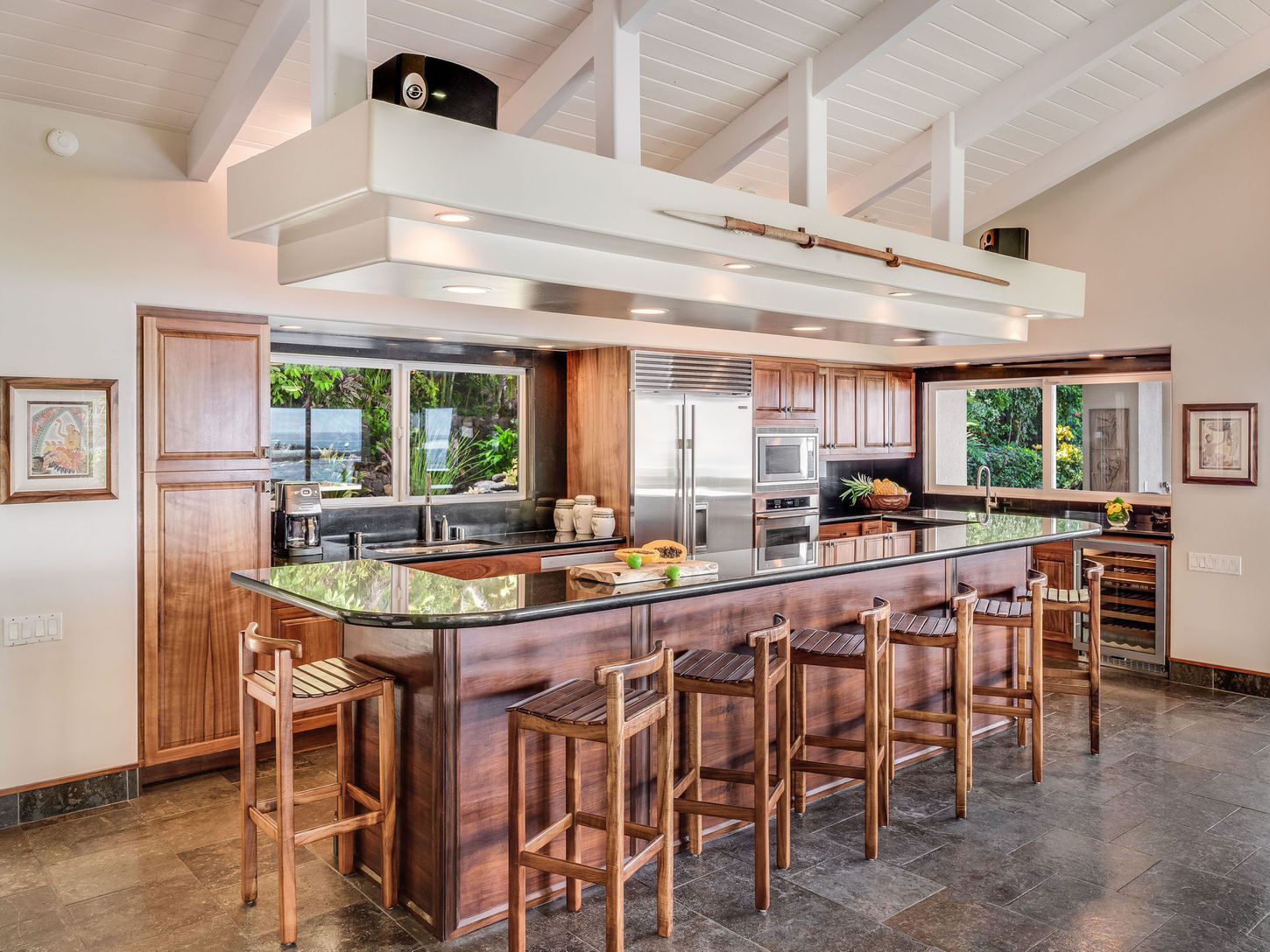 The oceanfront jewel envisioned by renowned designer Hamlet (Lucky) Bennett, offers a gracious welcome framed by tranquil koi ponds and rich Koa wood details. Inside, cool, artfully finished spaces create a serene retreat, from the elegance of granite countertops to the comforts of two inviting wet bars and a handsome billiards table. As the day fades, the lanai becomes your private theater—where sunsets ignite the horizon and spinner dolphins or wintering humpback whales play offshore.