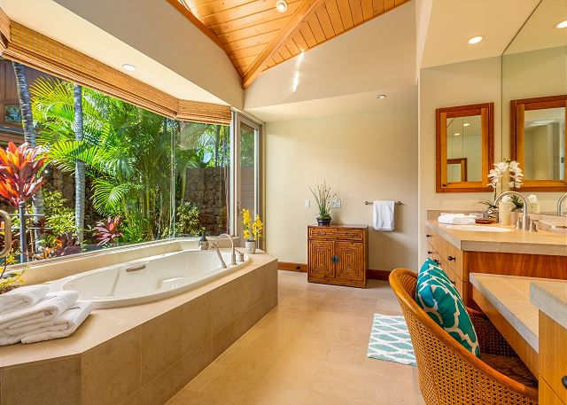 The intricate design of the home’s great room ceilings and extensive lighting add height and volume bringing more light to the space and providing for an open and spacious feeling. A rich new Koa entertainment center also highlights the great room while newly enhanced landscaping adds to the beauty and ambiance. This home offers a chef's dream kitchen equipped with professional 6-burner gas range, wine cooler, "Nespresso" machine, 2 dishwashers, warmer drawer and bar refrigerator among the extensive appliance package. Guest rooms include two primary suites (King), each with tropical outdoor garden showers and a third bedroom (Queen) with a separate private courtyard. All bedrooms include luxurious Four Seasons linens.