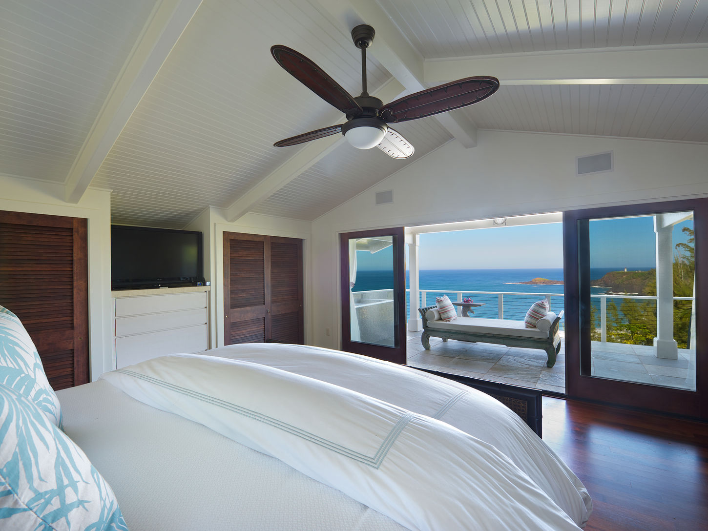 Situated on four acres with views of the ocean and lighthouse, this home enjoys a private tennis court, pool, Jacuzzi, and space for everyone. Between the mystical mountains and renowned Secret Beach, the estate is more than a home; you’ll feel the magic the moment you arrive. With more than 500 feet of ocean frontage, the estate is the perfect place to gather for family holiday getaways. This unique 6000-square foot home with over 1000 feet of wrap-around lanai is completely private from the surrounding properties. The home comfortably accommodates 12 guests in seven bedrooms. From the great room and upper master deck, you have a front-row seat to view migrating whales and pods of dolphins. The grounds are designed with water gardens, an enchanting labyrinth, and a Hawaiian fruit orchard planted with avocado, citrus, apple bananas, star fruit, kumquat, and mango trees. From the organic vegetable garden, you’ll find beautiful herbs and salad greens to pick and eat. Four bedrooms are located downstairs and another four bedrooms are upstairs. The primary suite with an unsurpassed view of the Kilauea Lighthouse offers a luxurious bathroom decorated with crème granite, imported sea glass, and a steam /shower. There is an oversized daybed perfect for lounging the days away, journaling, reading, and complete relaxation. The second primary bedroom is ultra-spacious and includes an en suite bathroom and beautiful views of the mountains and the ocean. Add to this, three additional king bedrooms, and the upstairs queen bedroom has an adjacent bathroom, the "grandparents' room" has two queen beds complete with private bathroom. Each bedroom has views of the gardens, mountains, pool, and ocean. The great room in the main house was designed for entertaining and comfort; the furnishings are a modern mix of Pacific and Balinese. The kitchen features state-of-the-art appliances including an eight-burner Viking range, two refrigerators, a wine bar, and an entertainment center. The estate has a separate prep kitchen which is ideal should you hire a private chef. The media room is complete with a 55” flat screen and a surround sound system, Blueray, and unlimited Direct TV. This wing of the estate also includes a kid's playroom/nanny quarters.