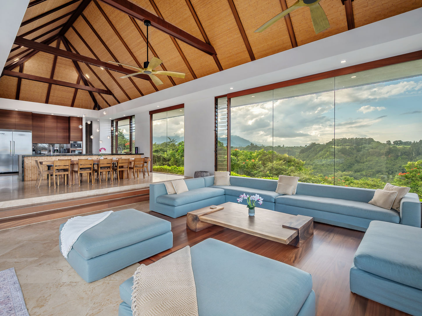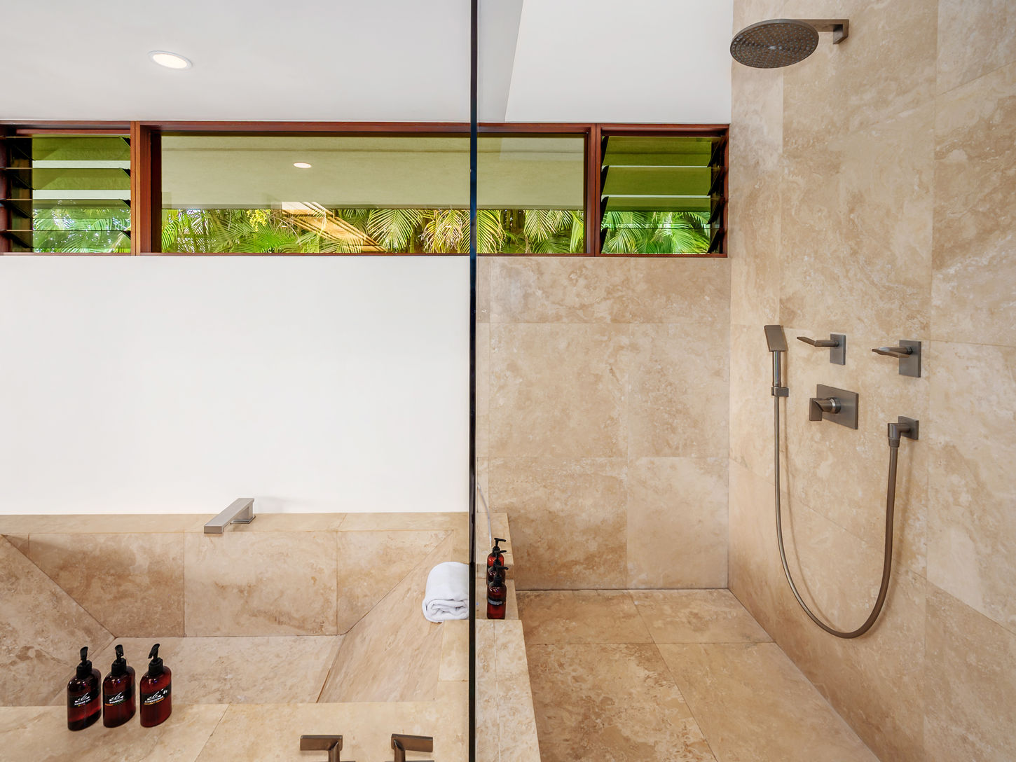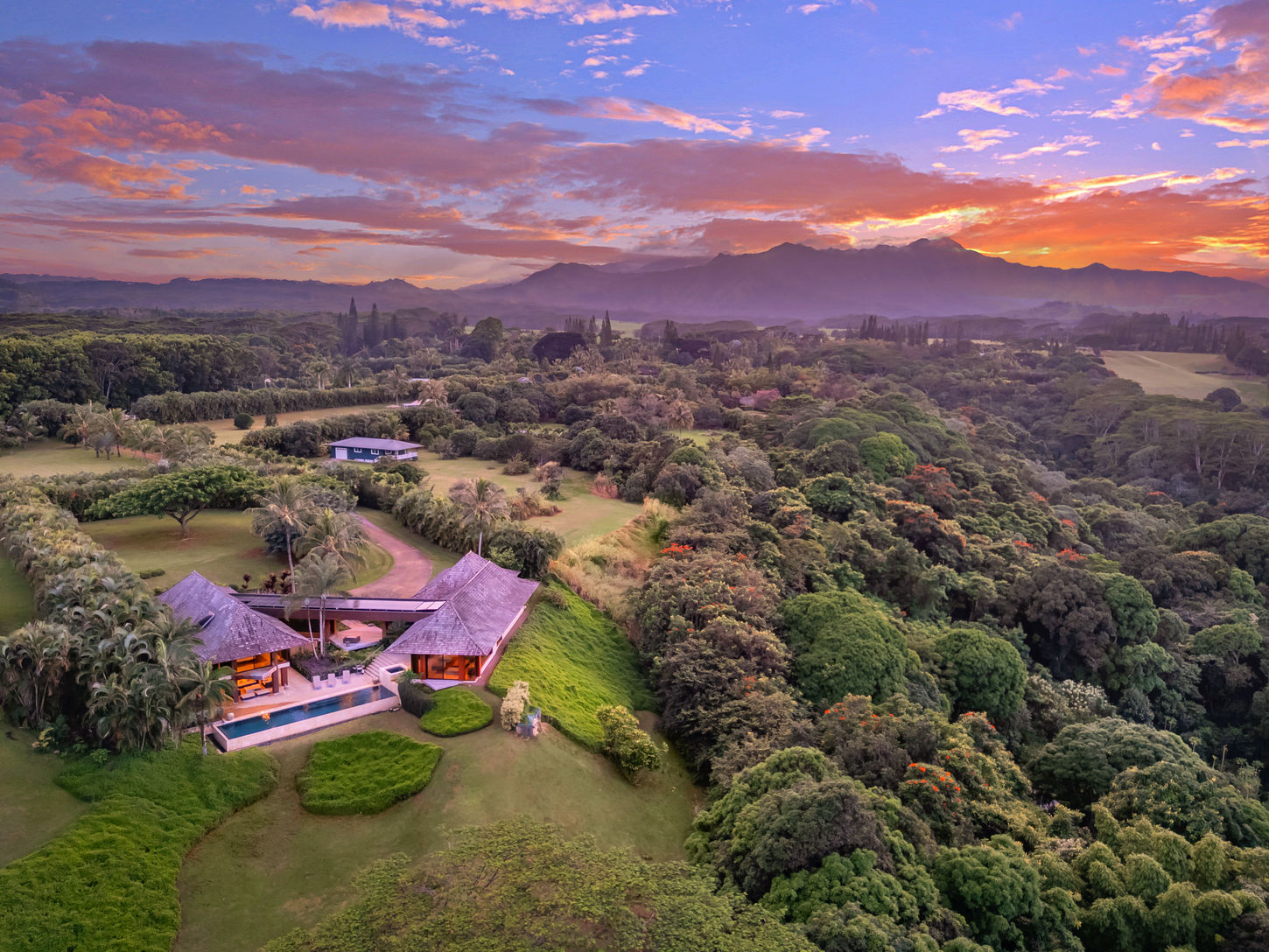 This elegant estate is located above the meandering river which runs to Kahili Bay, Rock Quarry Beach. The home offers panoramic ocean views of Kahili Bay on Kauai's spectacular North Shore. An infinity pool, spa, and six bedrooms complete this clean and modern home. The property is spacious and luxurious with floor to ceiling windows in every room. Space is abundant, both indoor and outdoor, making for an unforgettable experience and holiday. Award-winning architect, Gary Tobey, has outdone himself.