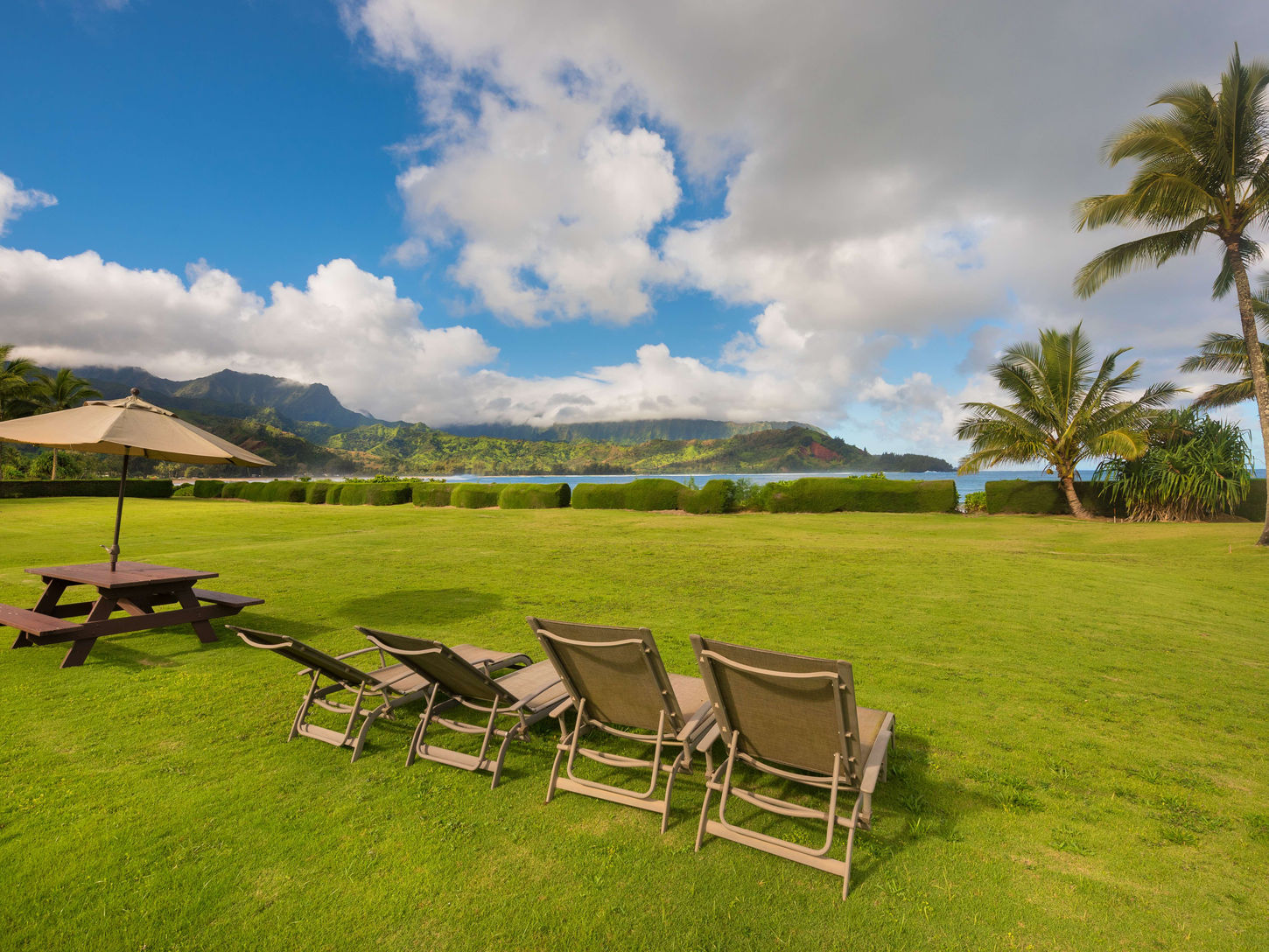 This charming home is located on the beach in Hanalei. One of the world's most beautiful beaches, Hanalei Bay is surrounded by emerald mountains and waterfalls. The home offers four bedrooms and four bathrooms with a cozy covered porch on the bay side. This home boasts one of the most enviable locations on the North Shore. Imagine the kids, and you, meeting your surfing instructor right in front of your holiday home and spending hours in the warm water and rolling surf. Hanalei town is a short bike ride distance with boutiques, restaurants, book shops, and bikini shops. The sunsets with the famous "Bali Hai" in the background will be etched in your family's memories for a lifetime.