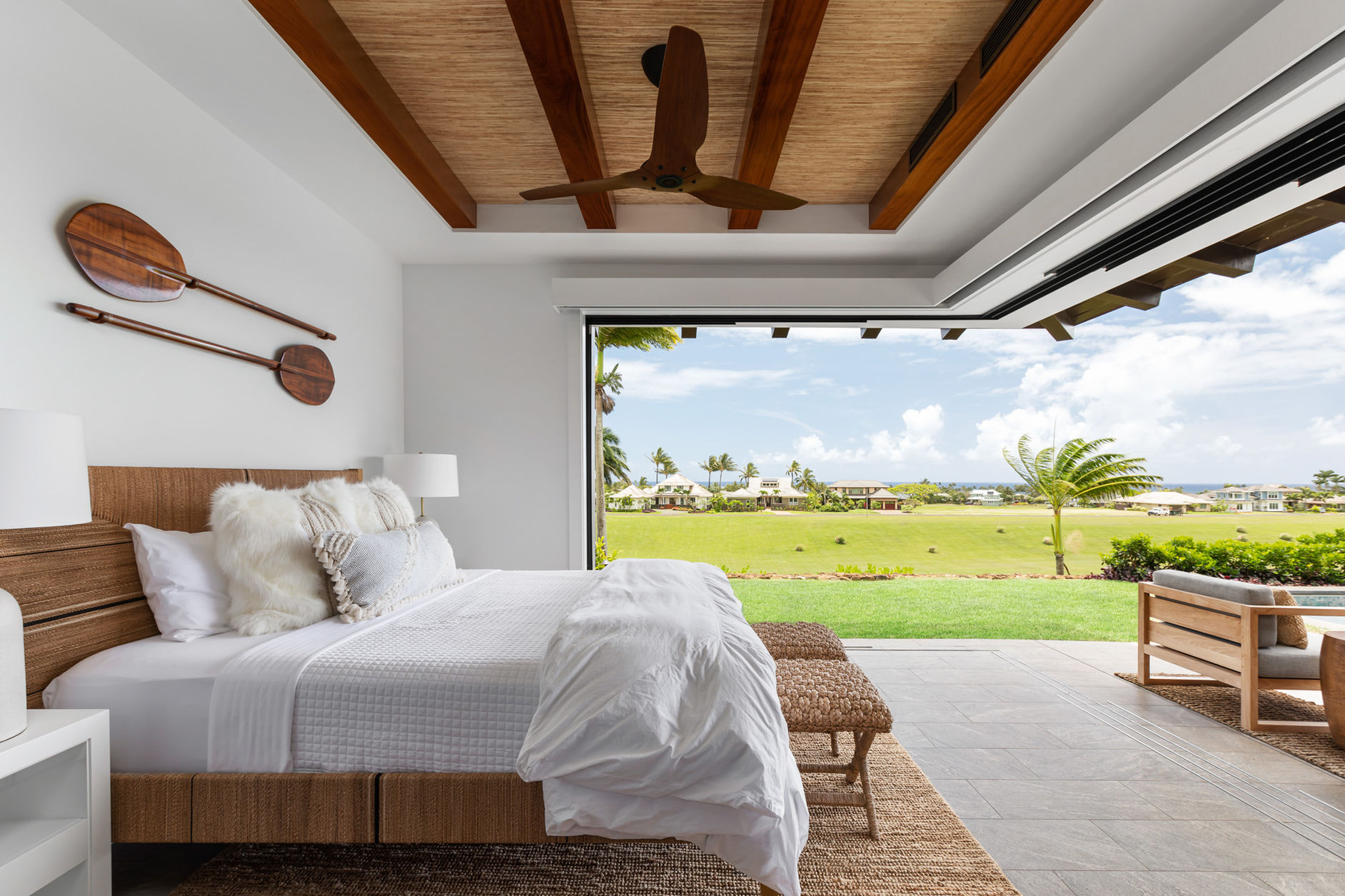 Three of the Kauai 2027’s bedrooms have king-size beds, and a bunk room provides the added flexibility of two full beds and two twins. Each bedroom comes outfitted with a television, and two have direct access to the pool deck. To ensure total guest comfort, there are 4.5 baths with luxurious details like stand-alone tubs, large walk-in showers, and outdoor lava rock showers. From families to groups of friends, guests will find this stylish and welcoming home ideal for experiencing the best of Kauai.