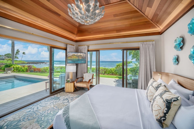 Primary Bedroom: Sweeping pool and ocean views, king bed, shared luxury bath with walk-in shower