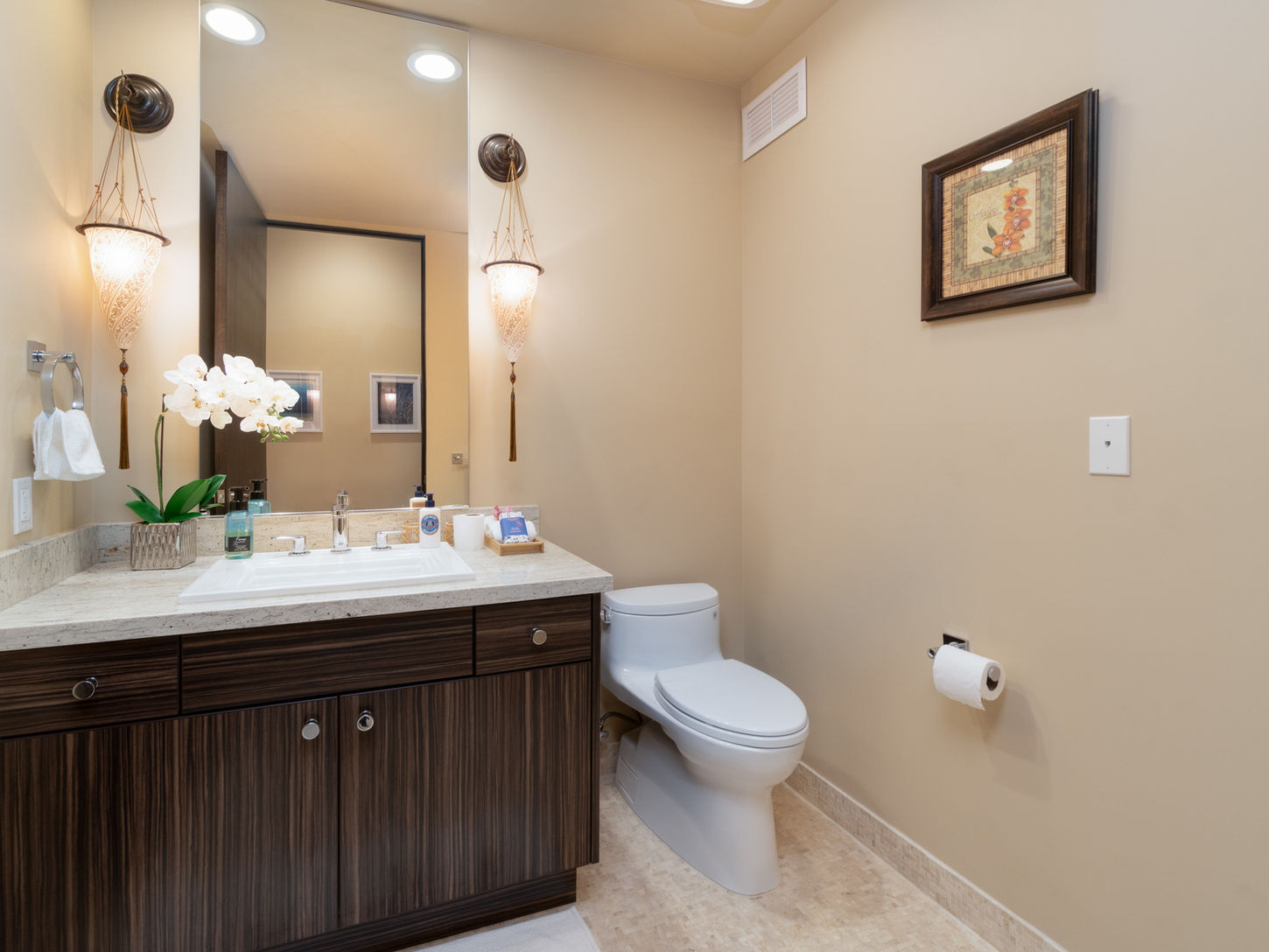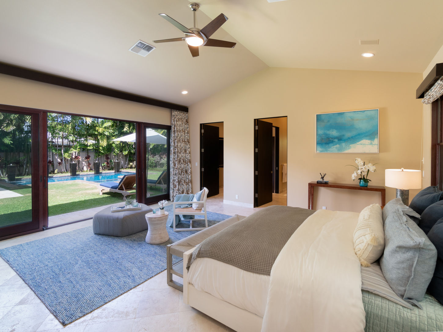 As you walk in, a grand 2-story foyer leads the way to bright, airy casual and formal living areas to your left, and spacious bedroom quarters to your right, all in light, neutral tones, decorated with minimalist artwork, and accessible on a single floor. The living spaces are equipped with auto pocketing doors and screens that can disappear, providing the ultimate indoor-outdoor living experience. The formal dining area, with a handcrafted Balinese wooden dining table, is a perfect complement to the grand living room, which opens up to a covered lanai equipped with a built-in gas barbecue.