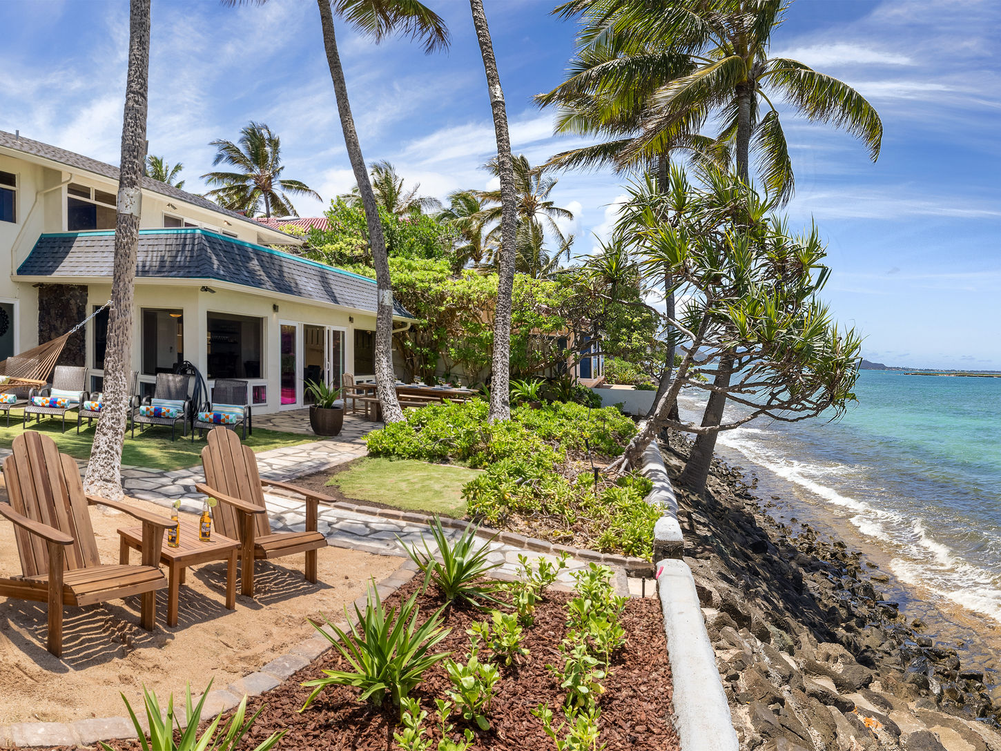 Six bedroom ocean front home with pool and Japanese-style onsen (hot tub) is ideally suited for multi-family or multi-generational accommodation. Recent renovations and 2021 upgrades include split-air conditioning throughout the home, updated landscaping, new furnishings including all beds and linens and a re-modeled kitchen that includes new stainless steel appliances, new dishware, and everything needed for those who love to cook.